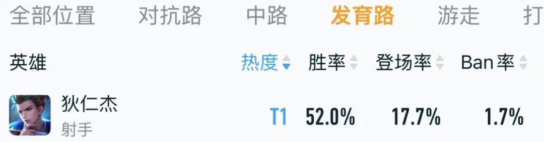狄仁杰在新赛季发育路的胜率颇高,已达52%,登场率高达17.7%。
